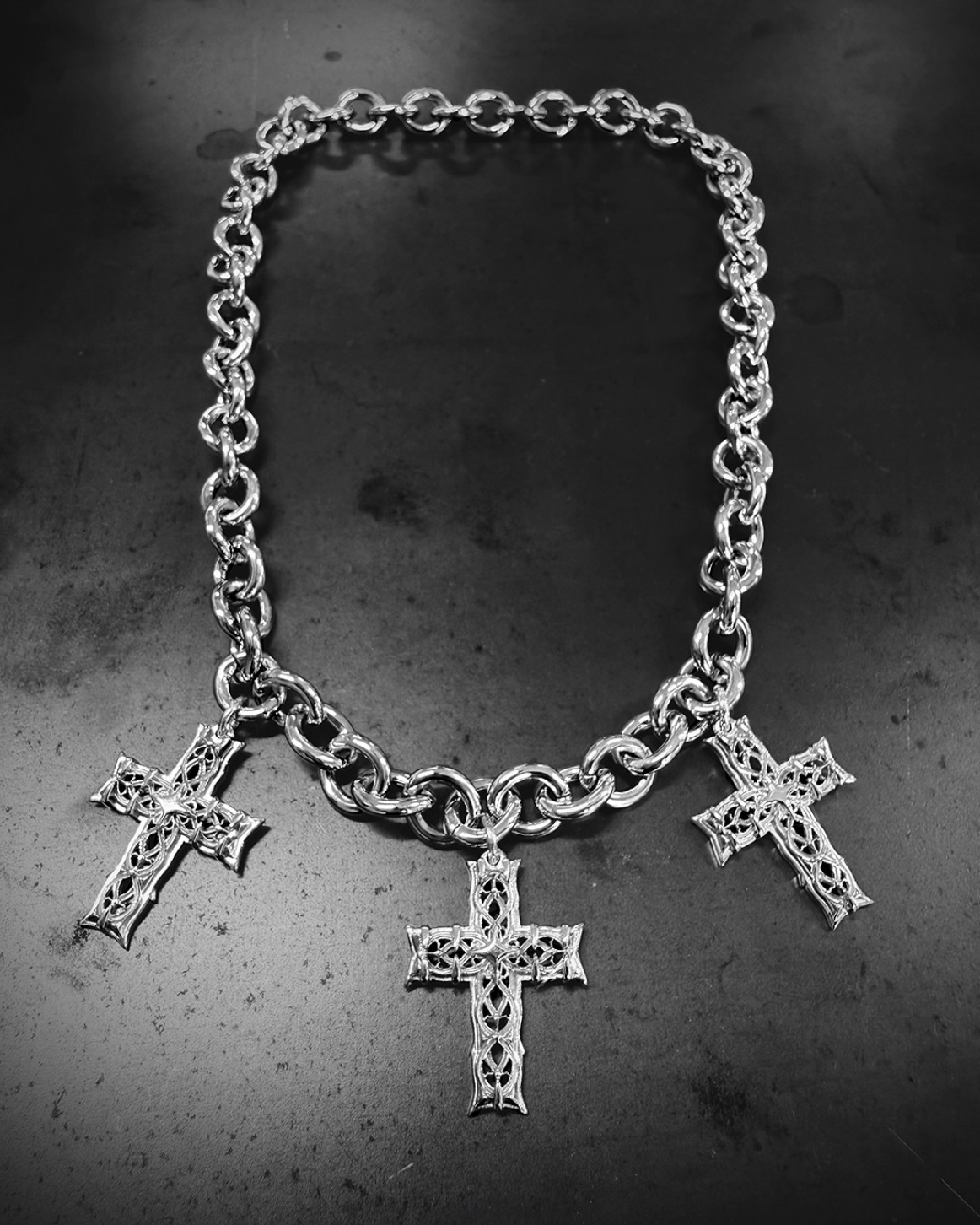 The piece features a double-chain design in aged gold with two hanging Notre-Dame crosses, signature of the Brand.