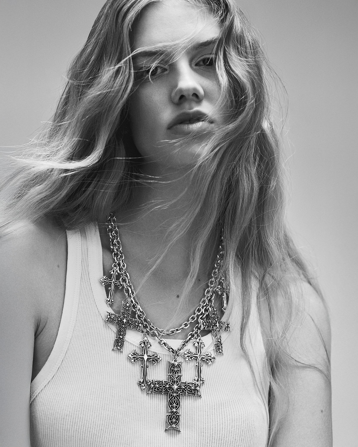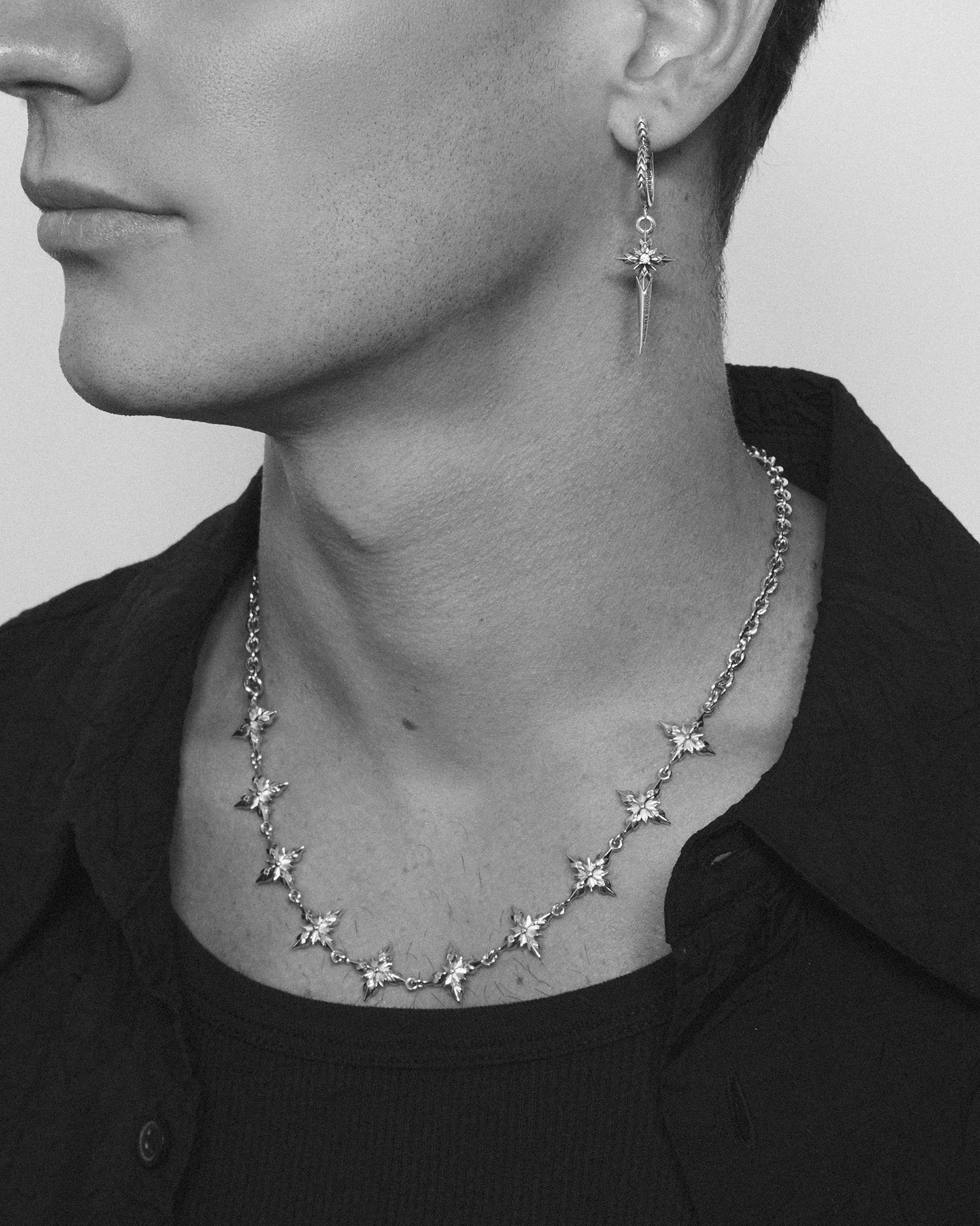 Gioielli oversize, come catene, croci o rosari di perle, perfetti per chi ama farsi notare. Ogni monile è un’opera d’arte che riflette la creatività e l'artigianato di Emanuele Bicocchi.