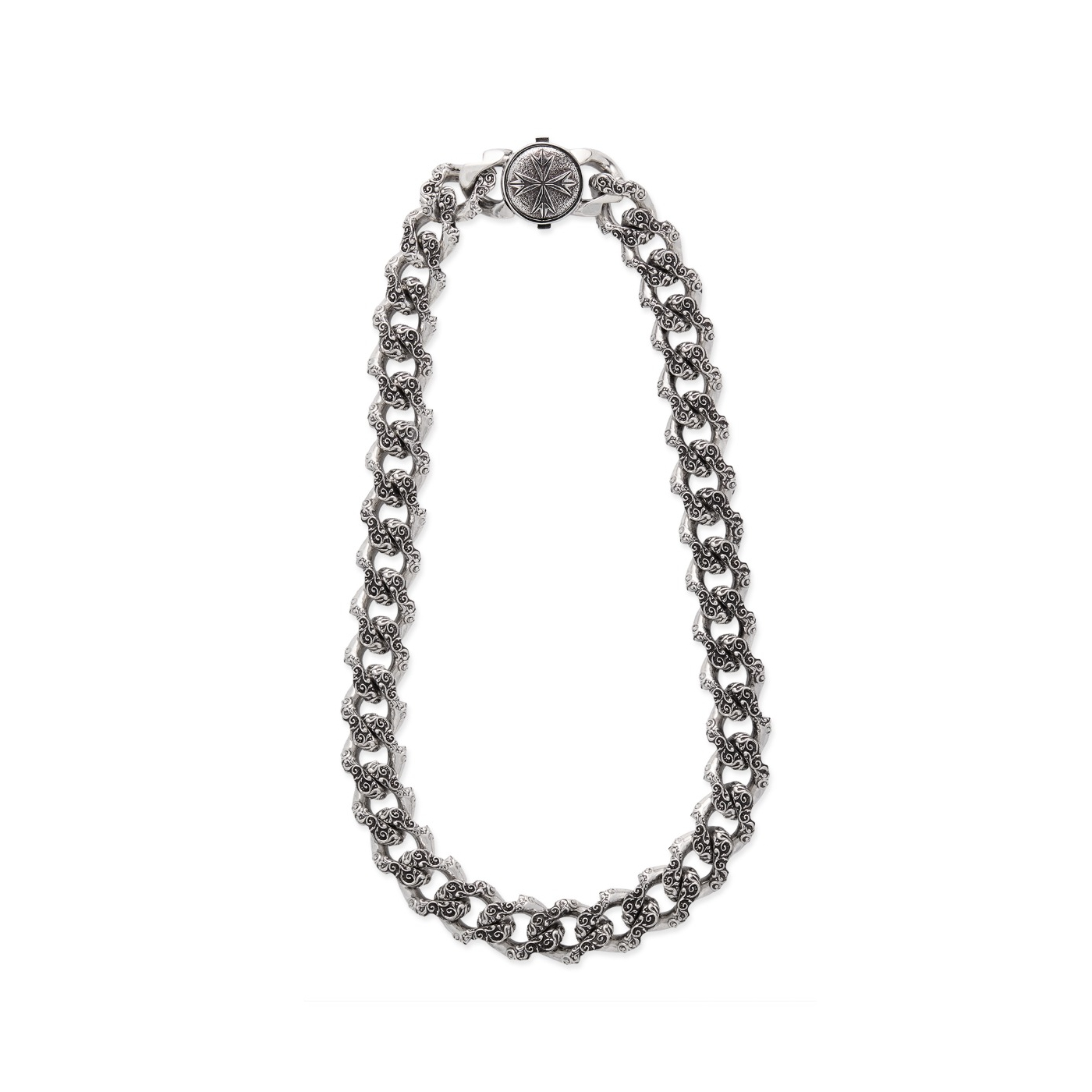 Signature Edge Chain necklace in sterling silver decorated with an intricate floral motif throughout its links and a box clasp engraved with the Emanuele Bicocchi logo.